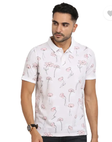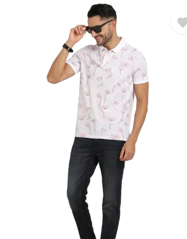 Men Printed Polo Neck Cotton Blend White T-Shirt