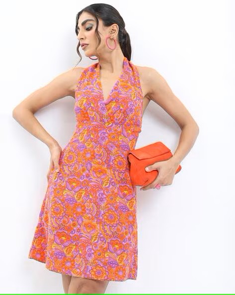 Women Floral Print A-Line Dress with Neck Tie-Up