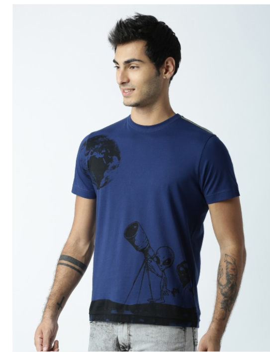 Navy blue printed T-shirt, has a round neck, short sleeves