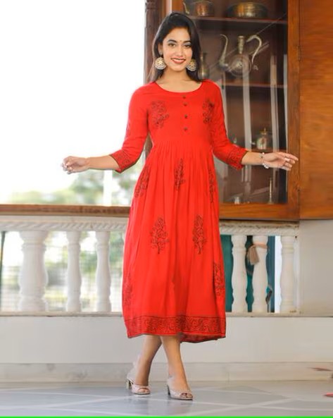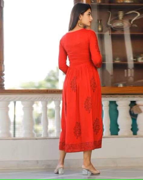 Women Block Print Round-Neck Gown