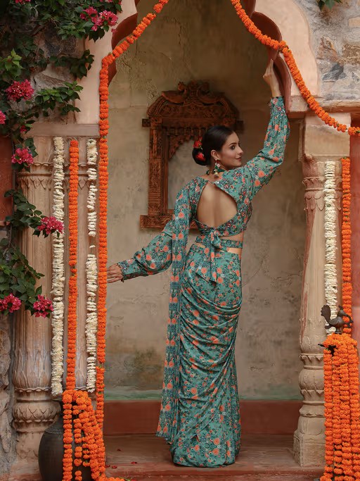 The Saree Features A Captivating Boho Print with Motifs That Seamlessly Blend Shades Of Green. These Two Contrasting Yet Complementary Colours Create A Visually Stunning Effect. The Motifs On The Saree Are A Delightful Mix Of Traditional and Contemporary Elements, Incorporating Geometric Patterns, Floral Designs, and Abstract Shapes Creating Eclectic Look That Captures The Essence Of Bohemian Fashion. The Blouse Features A Balloon Sleeves and A V-Neckline. and A Belt Cinched with An Embroidery Patch At The Centre