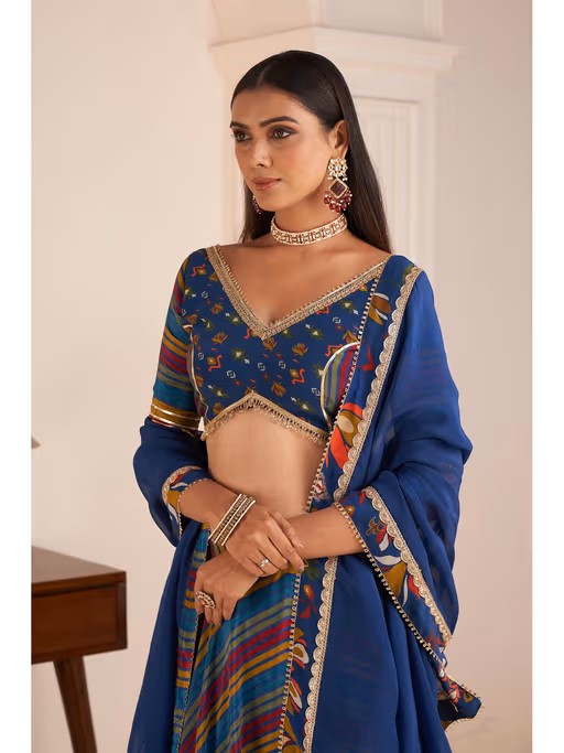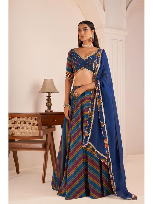 Blue Striped digitally printed Lehenga, paired with panelled blouse featuring embellished neckline, hem and sleeves. Look is completed with organza dupatta with printed border and gold lace.