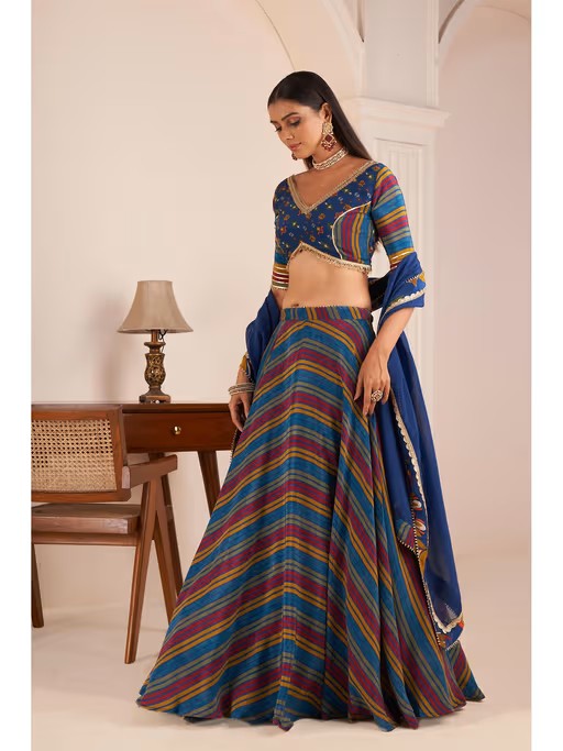 Blue Striped Lehenga with Embellished Blouse and Dupatta (Set of 3)
