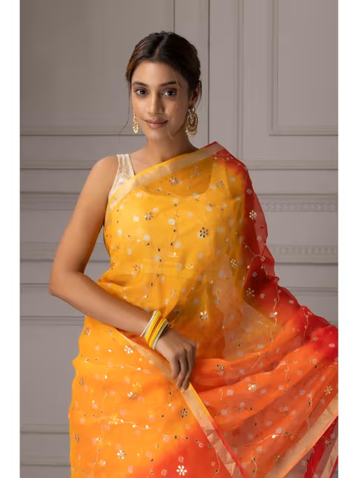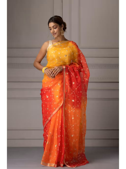 Geroo Jaipur brings an elegant Pure Kota Silk bandhani saree to grace your ethnic collection. The handcrafted Gota Patti work transforms this saree into an artistic treasure and makes it a wardrobe must-have. It is designed in fresh shades of yellow & orange and adorned with a zari border making Saree the right choice for celebrations. It is paired with an unstitched blouse piece.