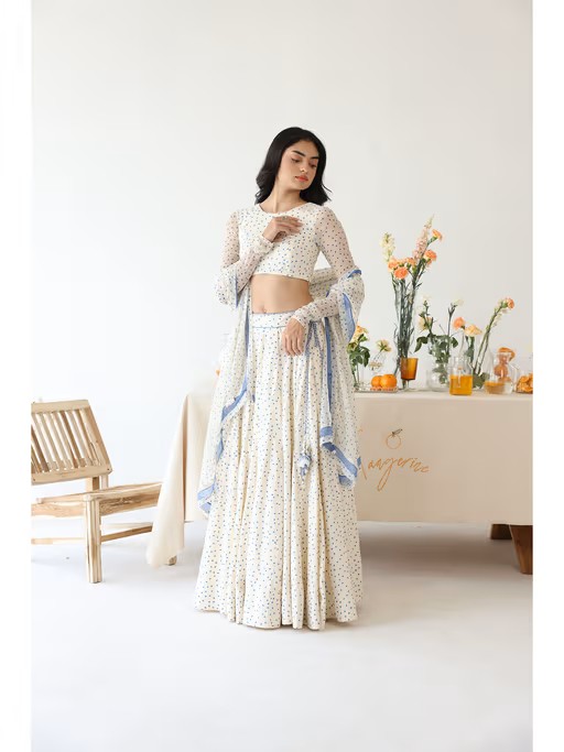 Petal off-white polka dot printed lehenga is adorned with handmade tassels on a blue and white thread braided dori, featuring elegant hand embroidery on the waist belt. Paired with a rayon moss polka dot printed blouse with chiffon printed sheer elongated sleeves and a hand-embroidered button. Complemented by a polka dot printed dupatta with a solid blue chiffon border, adorned with connecting lace and beautiful handmade flower tassels.
