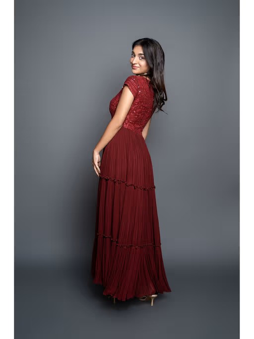 Get this trendy and stylish chikankari Indian wear from the house of Shahmeen Husain. It is crafted from high-quality georgette fabric. It features maroon embroidered dress with dupatta, it has half sleeves, round neck and slip on closure. Team it up heels and potli bag to complete your look.