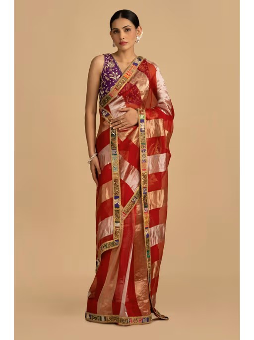 Detailed Gold Zari Work And A Luxurious Organza Silk Base Make This Banarasi Saree Popular Amongst Women. Designed With Current Fashion Trends, The Traditional Patterns, Vibrant Red Hue, And Elegant Finish Make This Masterpiece An Ideal Choice For Weddings And Events.