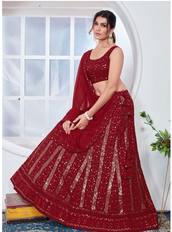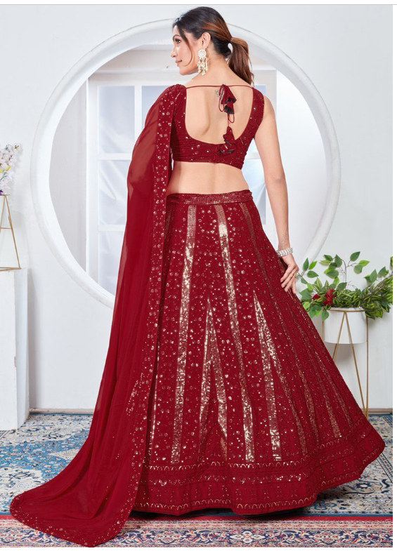 Red Sequin Thread Embroidered Faux Georgette Lehenga Set