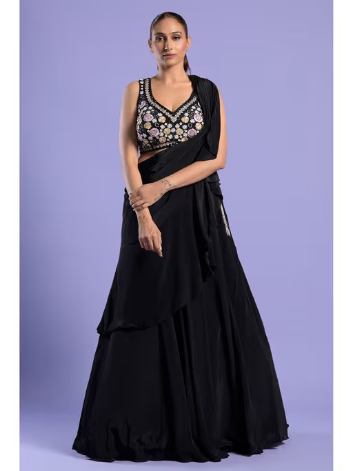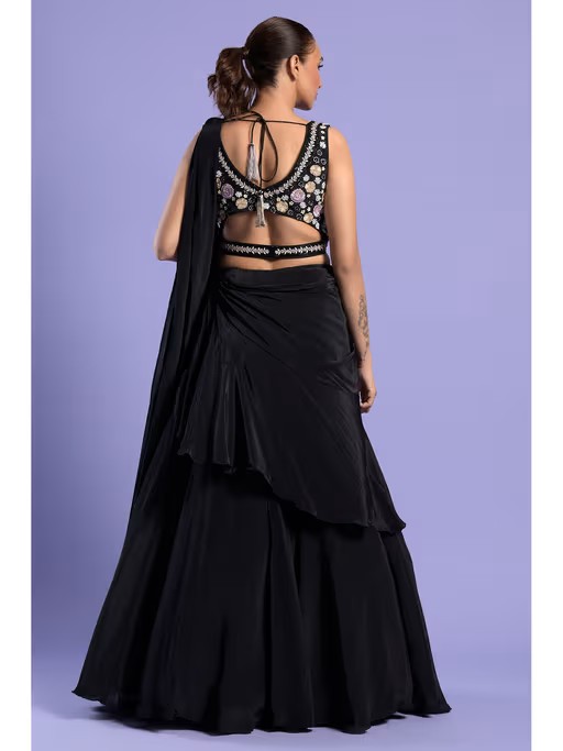 Indulge In The Luxury Of Our Black Crepe Lehenga Saree, Adorned With Intricate Resham, Sequins, Cut dana, And Black Nalki Detailing On The Embroidered Blouse.
