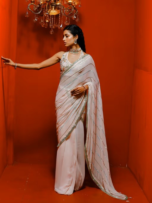 Sequins Saree Paired with A Chic Halter Neck Blouse. This Glamorous Ensemble Features All-Over Sequin Embellishments That Catch The Light Beautifully