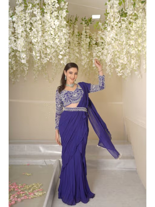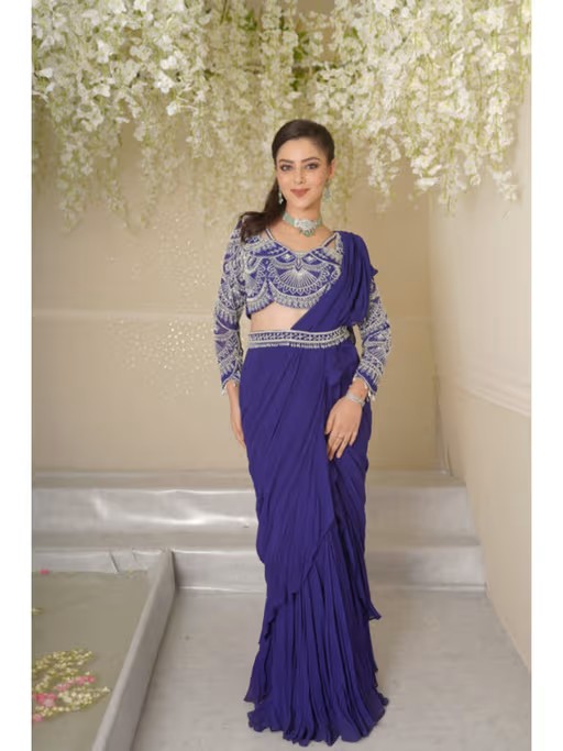 Scallop Pearl Hand Embroidered Blouse. Full Sleeves, Back Opening . Drape Saree With Side Zip. Embroidered Belt.