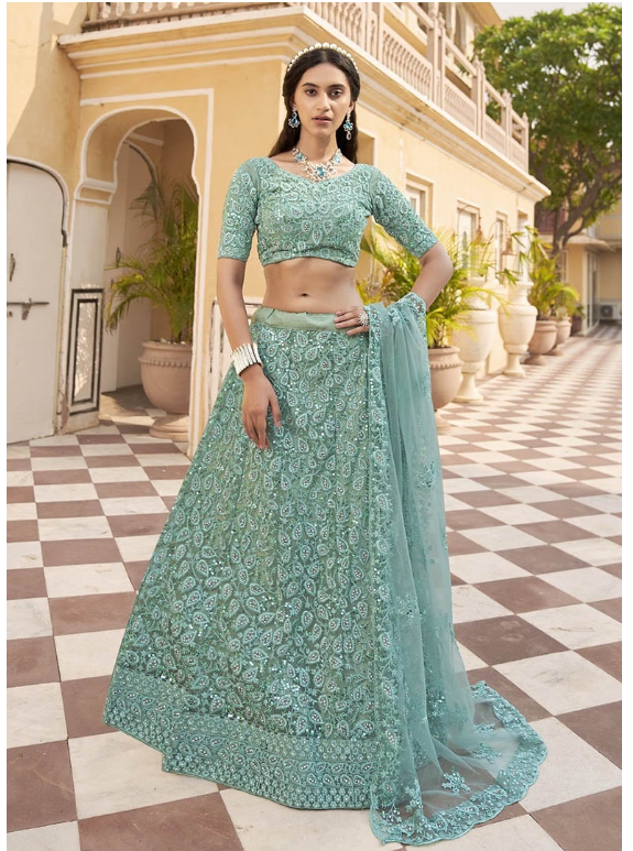 Step into elegance with this stunning Green Zari Thread Embroidered Net Lehenga Set, designed to turn heads at every celebration. A beautiful blend of tradition and trend, it's your perfect pick for any grand event.