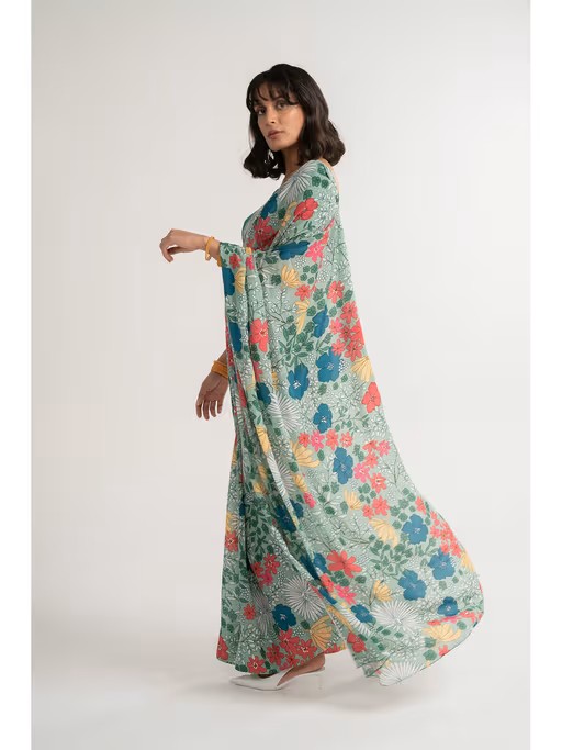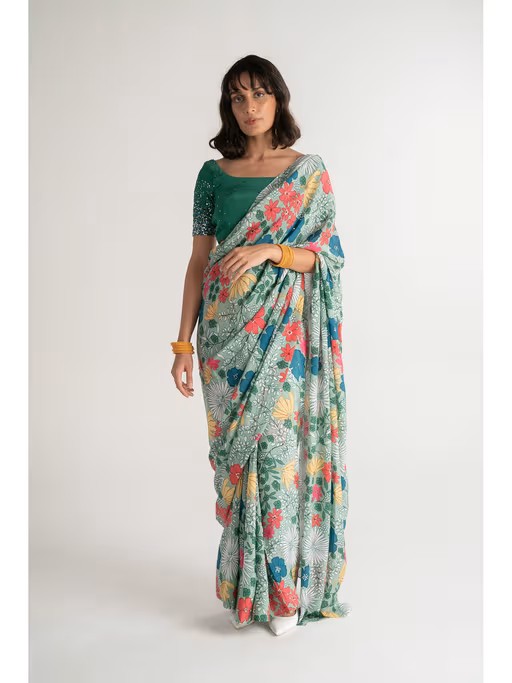 Ensemble - Saree Set Colour - Green Base Printed. Fabric - Crepe Silk. Surface - High Definition, Multi-Coloured Bold Floral Motifs, Digital Print and Sequence Embroidery. No Of Pieces In The Ensemble - 2. Key Features - The Set Has Sequence Embroidered Blouse with Sequence Highlight Saree