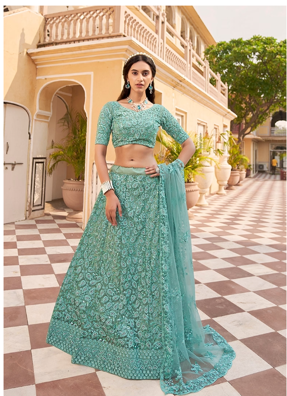 Step into elegance with this stunning Sky Blue Embroidered Net Lehenga Set, designed to turn heads at every celebration. A beautiful blend of tradition and trend, it's your perfect pick for any grand event.