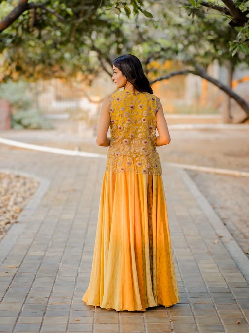 Overflowing colours of yellow makes this kali sari with jacquard lehenga and blouse ecstatic. Styled with a dori and glass beads embroidered jacket, it fits in the bright mood of summer.