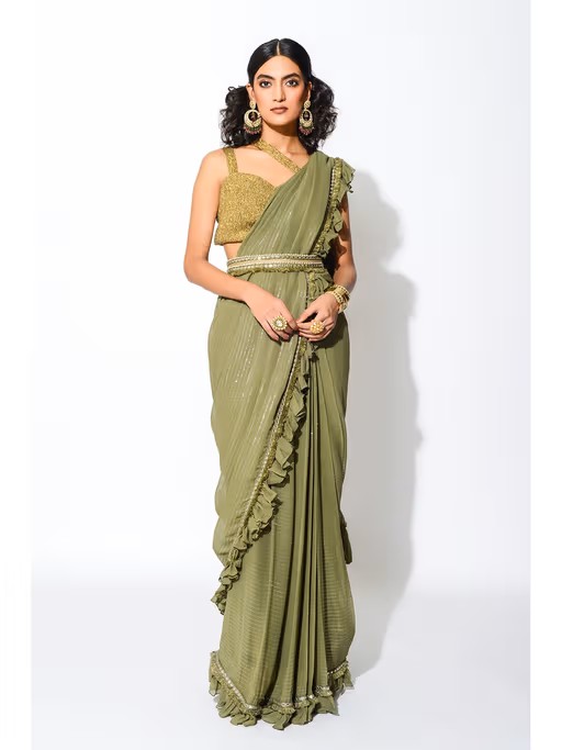 Make a style statement with this olive saree from Rishi & Vibhuti. Crafted from georgette, this exquisite saree comes with a stitched blouse and a belt. Team this saree with a pair of heels and statement jewellery.