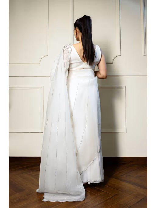 Opulent Ivory Pearl Silk Organza Saree with Stitched Blouse