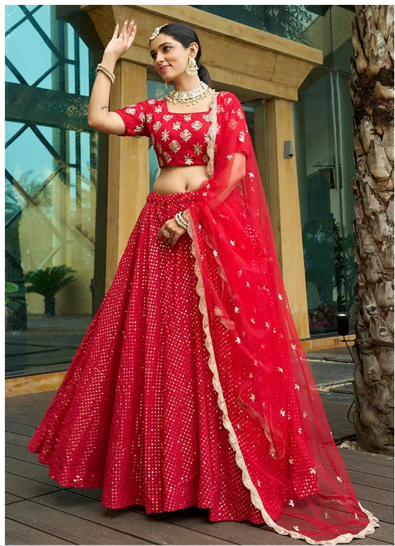 Step into elegance with this stunning Red Sequin Thread Embroidered Faux Georgette Lehenga Set, designed to turn heads at every celebration. A beautiful blend of tradition and trend, it's your perfect pick for any grand event.