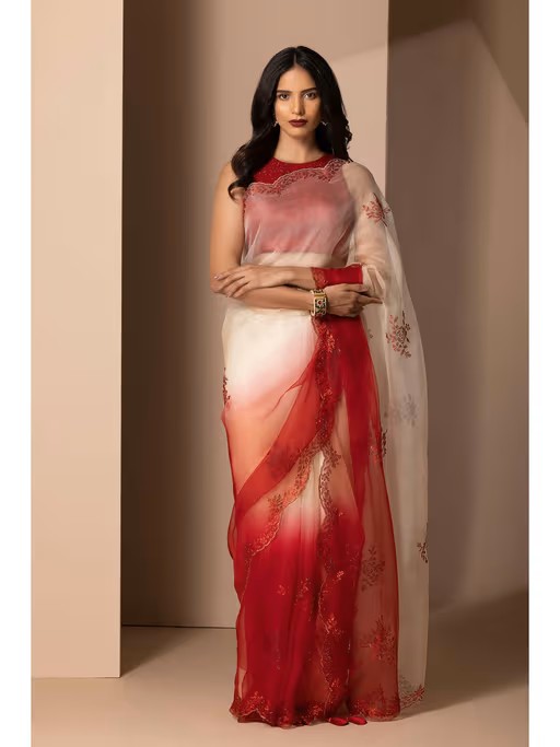 An Ombre Soft Silk Organza Saree Adorned with Rhinestones and Scalloped Border, Paired with Red Crepe Crew Neckline Blouse with Rhinestone Embellishment. Fabric : Silk Organza (Saree) and Crepe (Blouse)Colour - Red