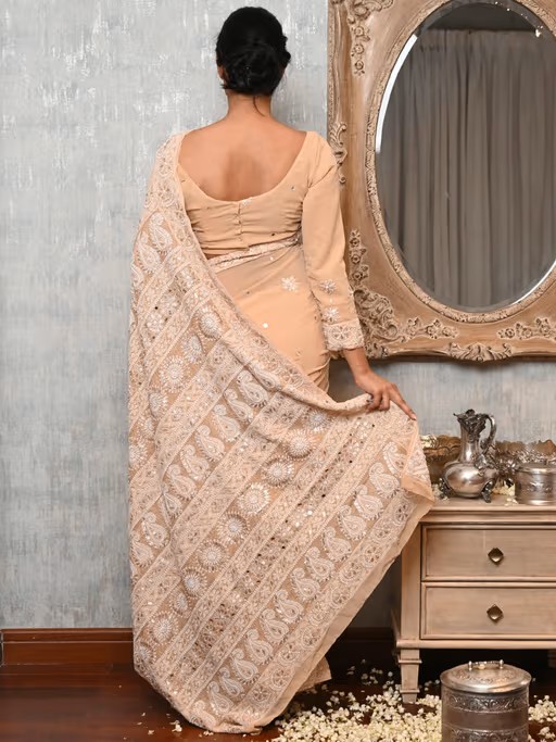 Exquisite beige chikankari saree with intricate gotapatti work, a perfect blend of tradition and modern elegance, and great for special events. (Saree Length:5.5 mtr, Blouse Length:0.8 mtr)