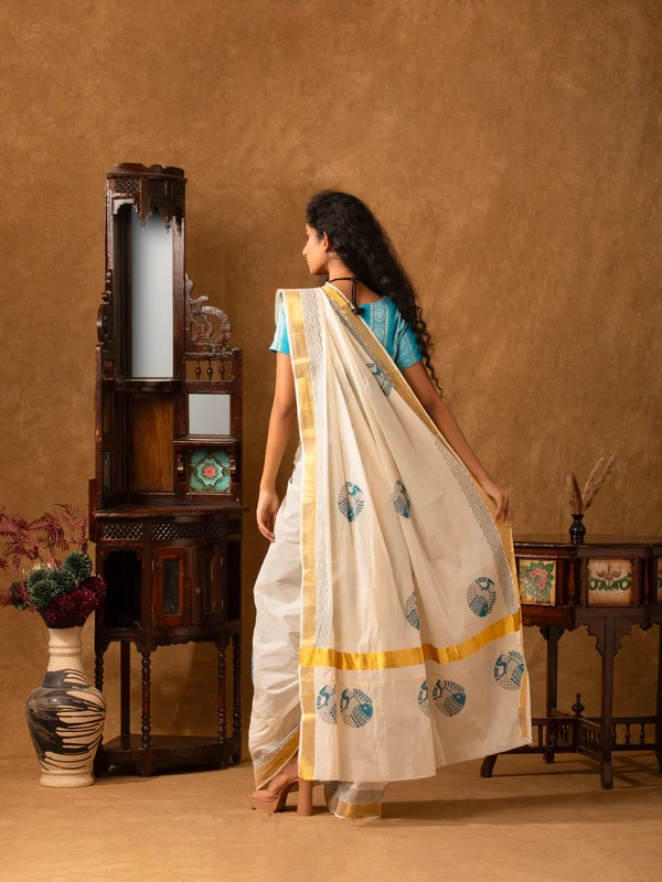 Fabric : Pure cotton Kasavu from Balaramapuram, Kerala, handblock printed with fish motifs
