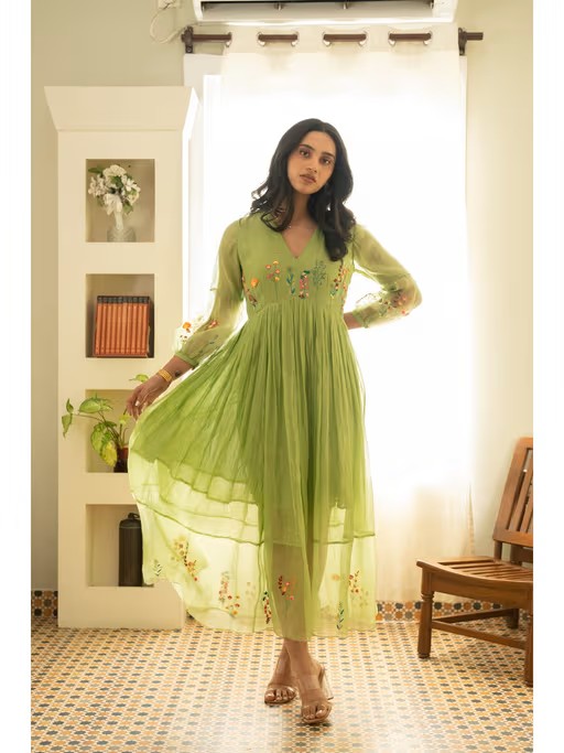 This Handcrafted Chander Dress Is A Graceful Blend Of Textures And Intricate Details. Featuring A Yoke Cut With Organza Accents, It Showcases Botanical Flower Motifs Intricately Embroidered With Anchor, Silk Threads, Zari, And Delicate Beads. The Puff Sleeves And V-Neck Add A Timeless Charm, While The Anti-Fit Silhouette Ensures Effortless Wear. Finished With Embroidery On The Yoke, Sleeves, And Bottom Hem, And A Discreet Side Zipper For Closure, This Dress Exudes Understated Artistry. Fabric - Chandrakala - Green Dress Length- 50"Sleeve Length - 19.5"Neck Depth - 8"Model Is 5'8" And Is Wearing Size Small. Please Reach Out To Us For Any Customisation.
