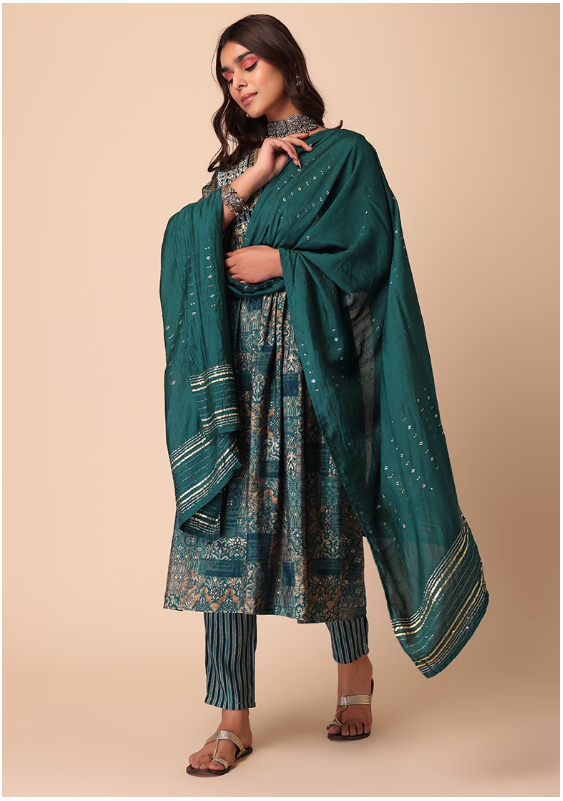 Easy to slip on, it features three quarter sleeves, a V-neck, zari embroidery and foil print.