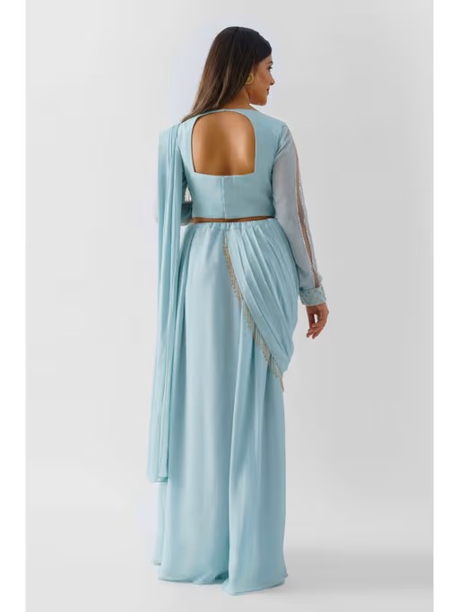 Adorn the styles specially made for you with this blue set from Suruchi Parakh. Made from high quality georgette, it features hook and eye closure and embroidered pattern along with full sleeves & round neck design. Pair it with trendy footwear to elevate your look.