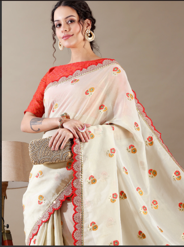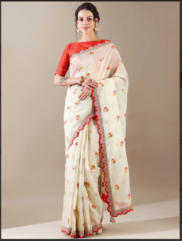 Ivory and Red Zari Border Tissue Organza Saree