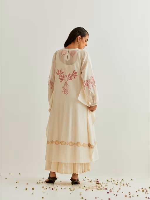 Make a style statement with this ivory printed kurta set from PRAMA by Pratima Pandey. Made from high-quality chanderi, the kurta features full sleeves and a round neck. It is paired with a fancy inner. Style it with minimal jewellery and sandals to complete the ensemble.