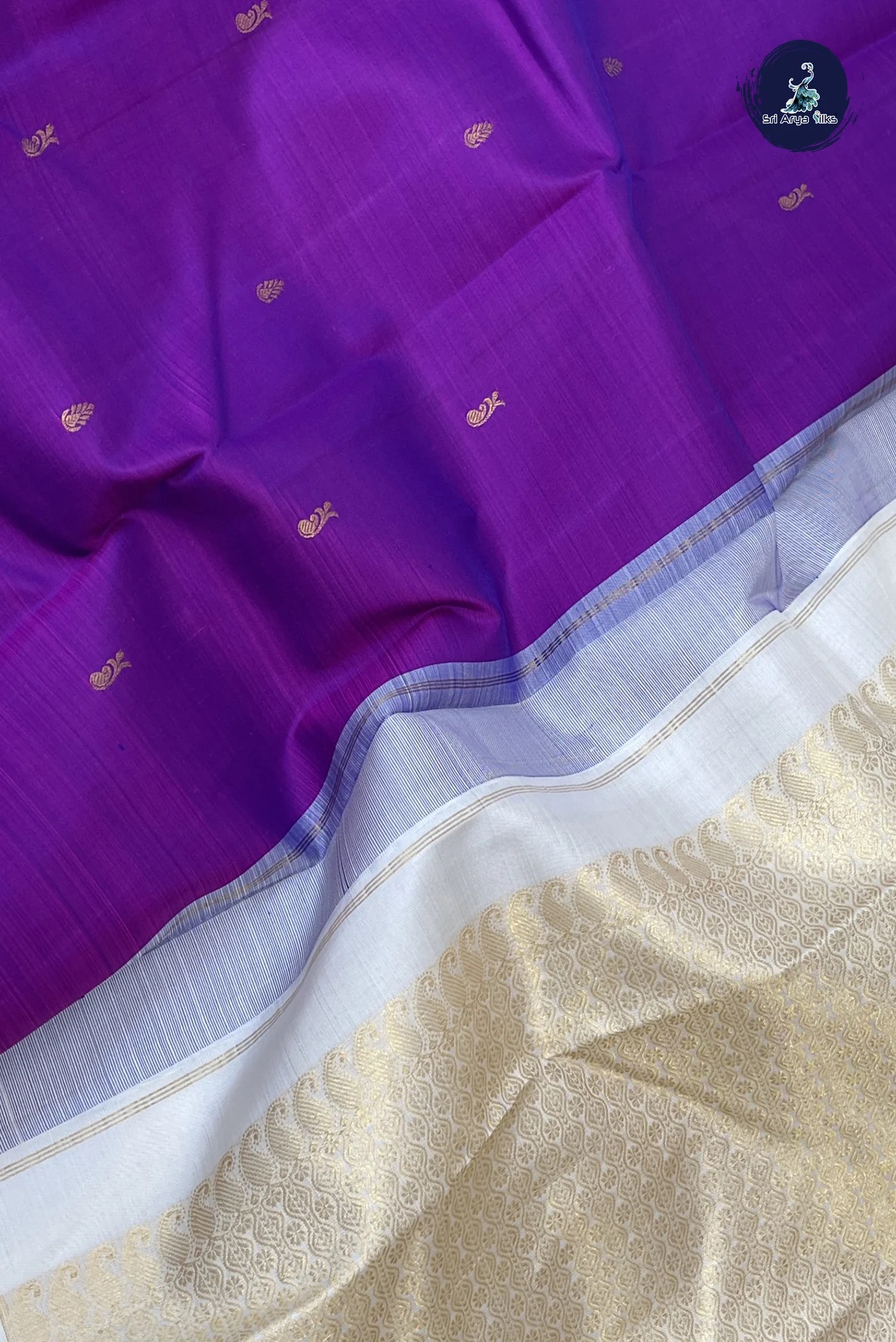 Presenting our exclusive Dual Tone Purple Korvai Contrast Silk Saree. This saree features a traditional border with 2 gram gold zari. The contrast border and the specially woven pure silk material further enriches the saree's appeal. Completed with zari buttas pattern, this saree promises a unique blend of tradition and style.