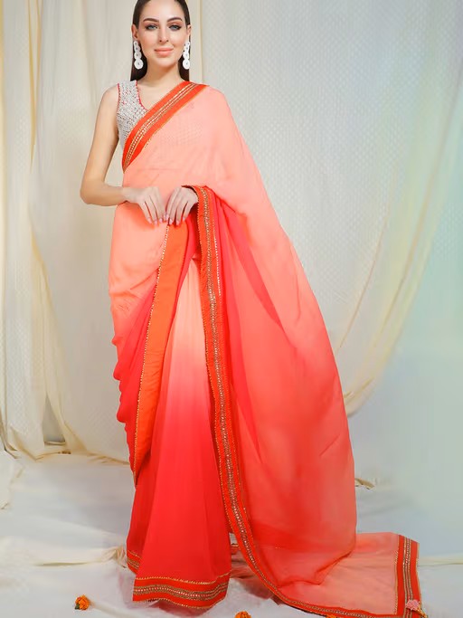 This festive season, illuminate the venue with your presence in Nikasha's ombre salmon to coral gajari chiffon saree with abla border. The outfit is beautifully embellished, you can add some bling to the outfit by pairing it with studded jewellery and footwear.This product can be customised to your requirements for size or colour. Please use the Nykaa Fashion App, and click on the whatsapp icon to get in touch with our customisation experts to place your order.