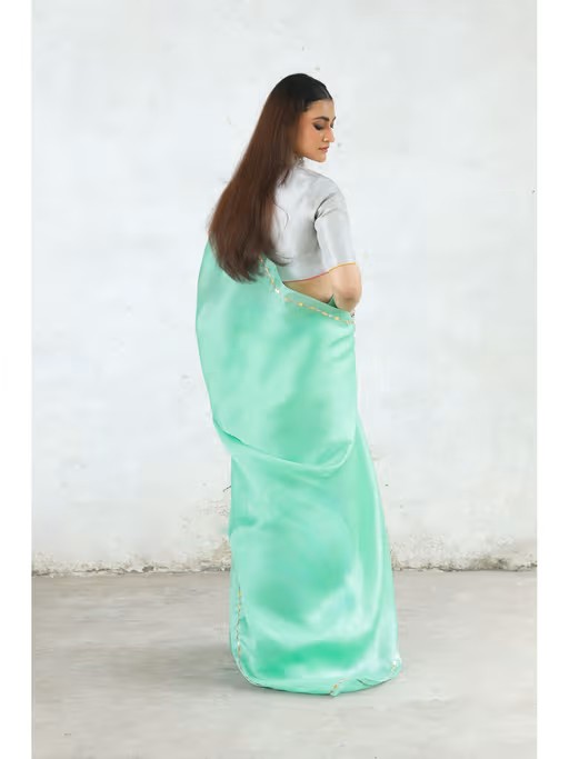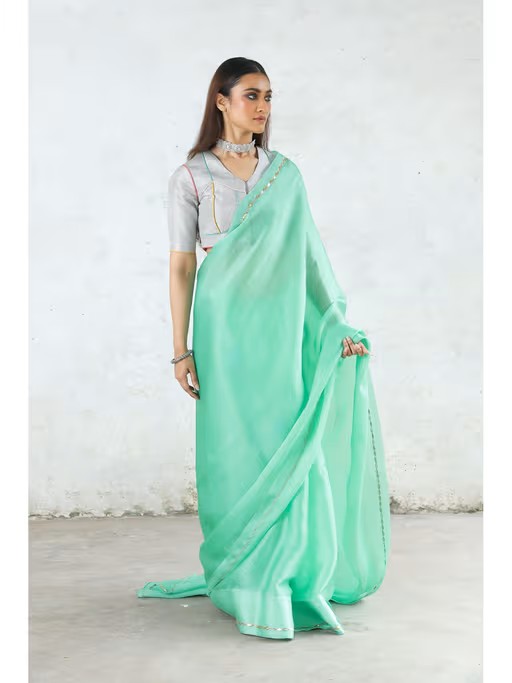 Handcrafted Saree In Pure Silk Satin Organza, Adorned With Gota Patti Detailing On The Border. This Saree Comes With A Plain Silver Unstitched Blouse Piece.