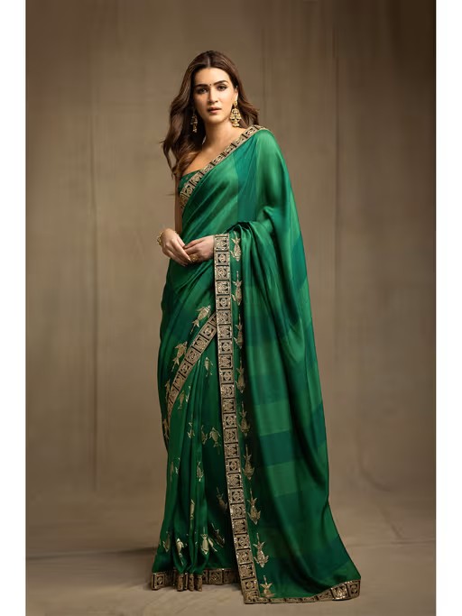 Saree Embroidered Borders. Embroidered Fish Motifs On Palla With Mystic Foil On Vertical Stripes All Over. Blouse Piece Comes With A Foil Printed Blouse Piece