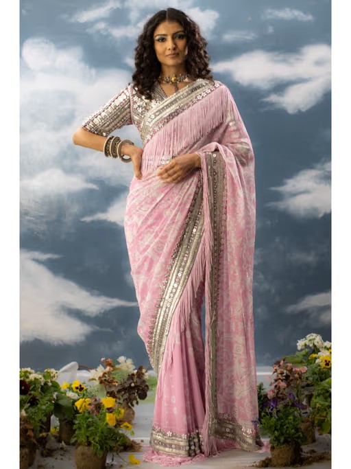 Lilac Pink Printed & Embroidered Saree in Chiffon -Handcrafted in Chiffon -Handpainted motifs printed on a chiffon -Hand embroidered border in metallic silver and adorned with fringes -Comes with unstitched unembroidered matching solid blue blouse piece in chanderi with hand embroidred border -The Blouse in the picture is for styling purpose only and can be purchased only.
