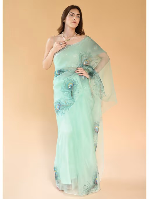 A Pastel Green Saree With Handwrought Roses In Iris And Light Crimson. The Saree Comes With A Pure Silk Organza Blouse Piece In A Pastel Green Shade As That Of The Saree. Handcrafted At Fallon- The Soft Pure Silk Organza Sarees Are Hand-Painted By Veteran Artists In Jaipur, Using Sustainable And Plant-Based Colours.