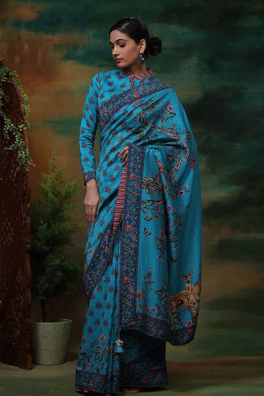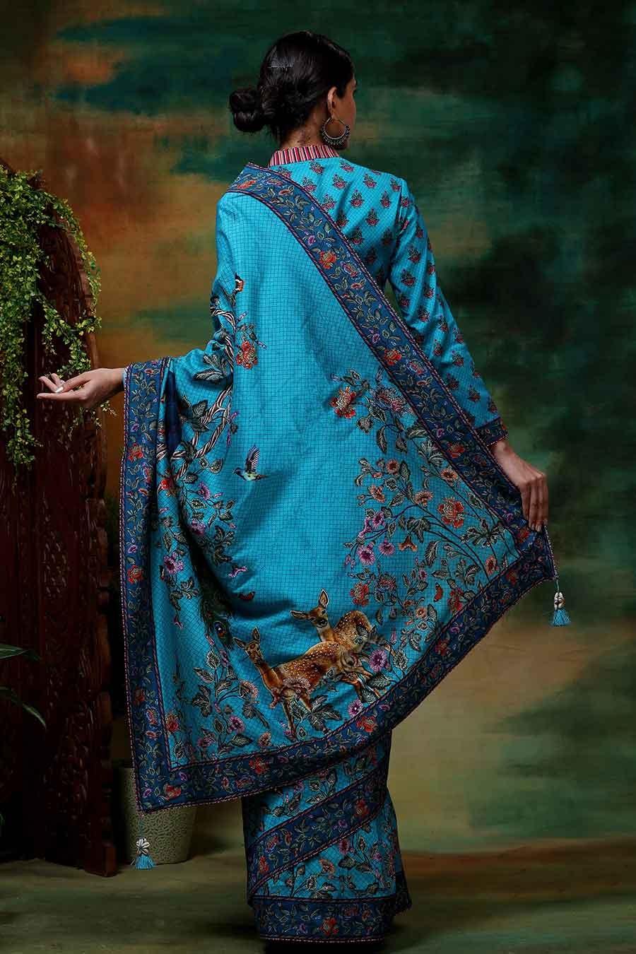 • Paired with a check and floral print saree