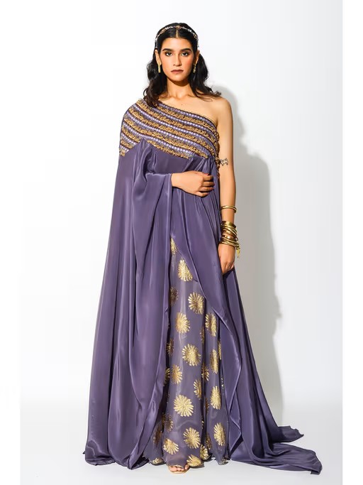 Make a style statement with this purple set from Rishi & Vibhuti. Crafted from georgette, it is finished with a sleeveless design and one shoulder silhouette. Team this set with a pair of heels and statement jewellery.