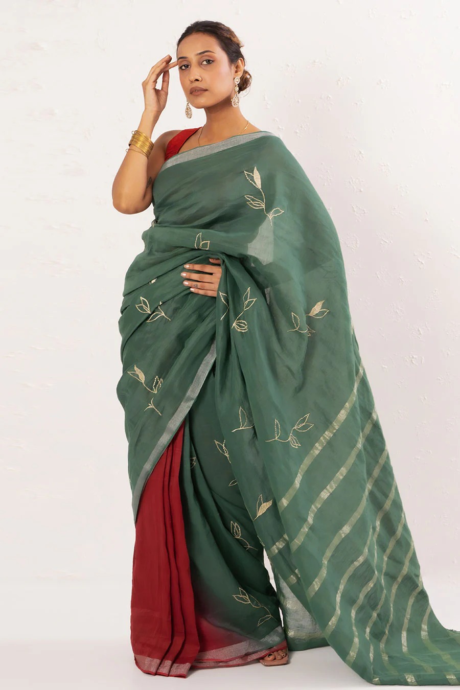 Green & Maroon Embroidered Handwoven Linen Saree