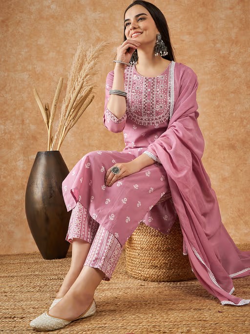 Infuse fashion-forward elegance with this pink kurta set from Vastramyaa. Made from high-quality cotton, this kurta features three fourth sleeves, a round neck, pull on closure, and a printed pattern, finished with a mid-waisted trouser and a stylish dupatta. Style it with minimal jewellery and sandals to complete the ensemble.
