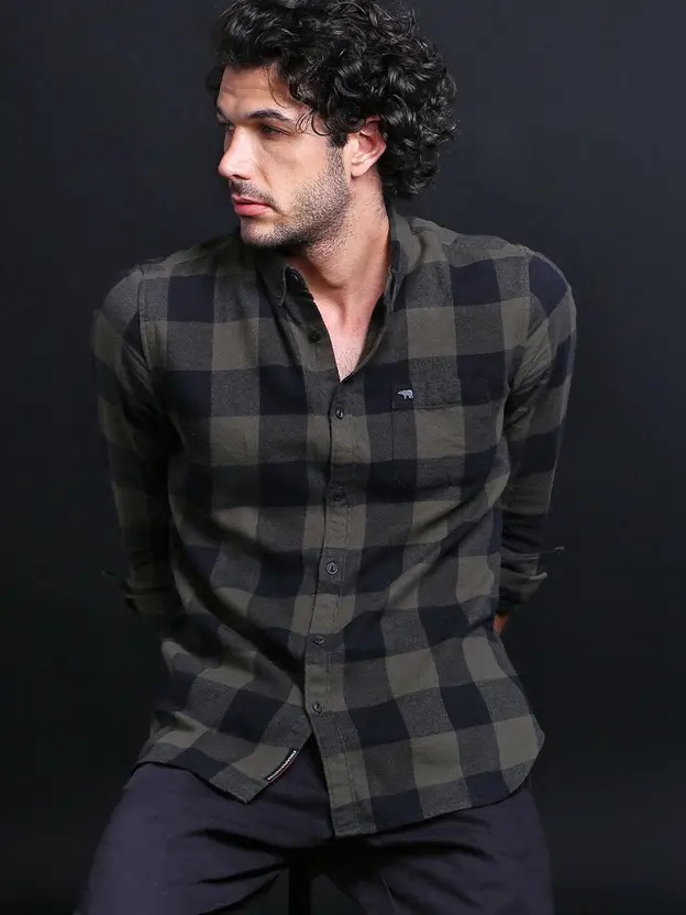 Men Slim Fit Checkered Button Down Collar Casual Shirt