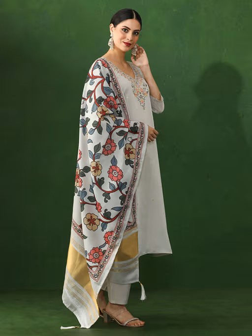 Embrace a comforting style with this Floral Chanderi Silk Off White Kurta Set. This A-Line Kurta For Women has a V-Neck, Three-Quarter Sleeves With thread work. Paired With a Pant.
