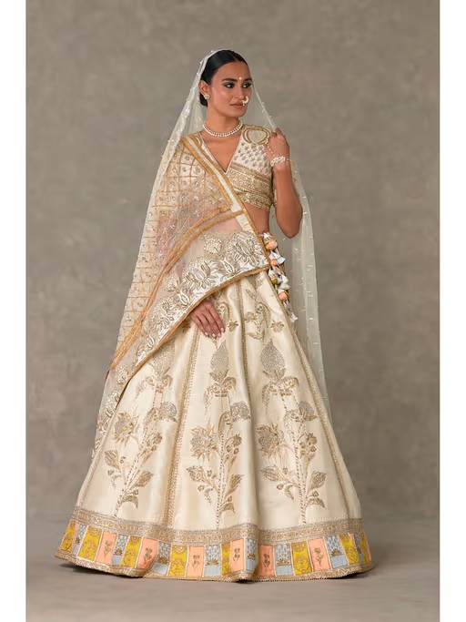 Lehenga- Lehenga adorned with embroidery with multi coloured resham, sitara & moti kaam |Contrast colour blocked border with embroidery and edged with kinari |Pocket detail | Side zip closure | Comes with a separate Can Can skirt Blouse- 'V' neckline | Elbow sleeves | Adorned with embroidery with multi coloured resham, sequins & moti kaam |Center back opening with tie-up tassel detail | Printed lining Dupatta- Organza dupatta embroidered with sequins |Embellished with embroidered borders and edged with jhallar |Printed backing |Tassel detail Trail- All over pearl cheent | Pearl Madakal finish