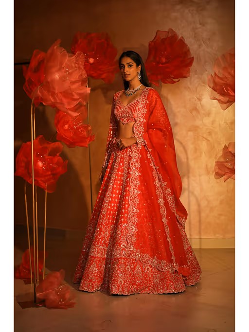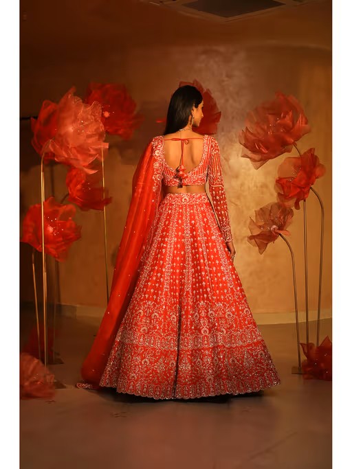 Add a dash of style to your wardrobe with this orange lehenga set from SWATHI VELDANDI. Crafted from raw silk, this stylish set is finished with full sleeves and a sweetheart neck. Style it with a pair of heels and statement jewellery.