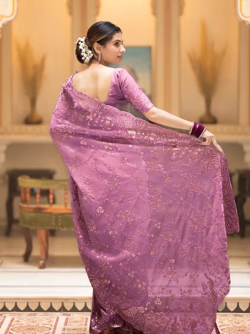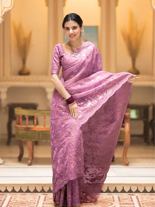 Channel your inner diva with this purple embroidery french silk saree with unstitched blouse from Zilikaa. Crafted from high-quality silk. This saree features an exquisite embroidered design. Style it with a pair of heels and diamond earrings for an elegant and soft look.