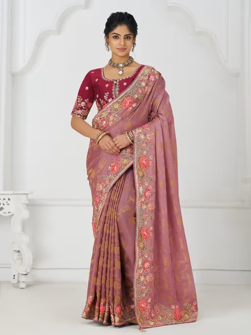 Pink Viscose Silk Embroidered Saree with Unstitched Blouse