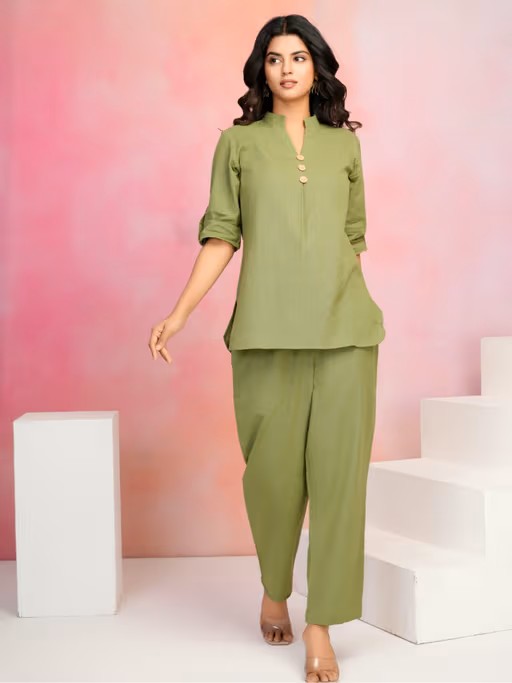 Parrot green mandarin collar V neck with big stitched buttons with short sleeve co-ord set in cotton flex. A stylish and comfortable co-ord set featuring a perfectly matched top and bottom, designed for effortless elegance and versatility. Ideal for casual outings or dressed-up occasions.