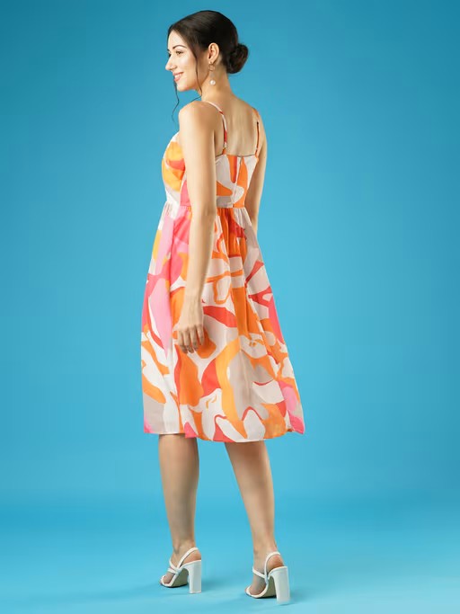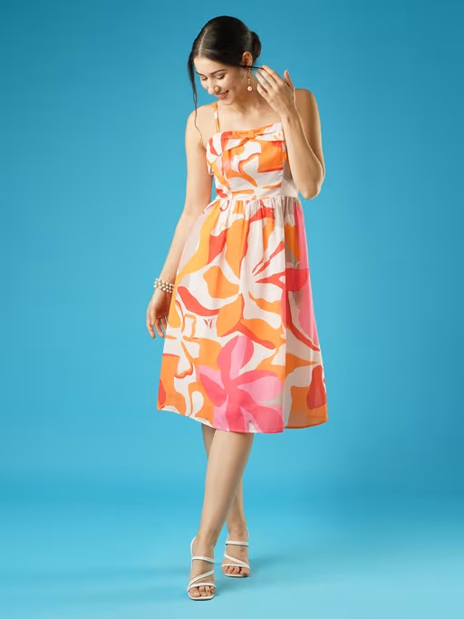 Step into floral elegance with the Globus Women Multi Floral Printed Square Neck Strappy Shoulder Bow Design Panelled Fit & Flare Midi Dress. Featuring a square neckline and delicate spaghetti straps, this fit & flare dress showcases a vibrant floral print. The panelled design and concealed zip closure ensure a sleek silhouette, making it ideal for casual gatherings.