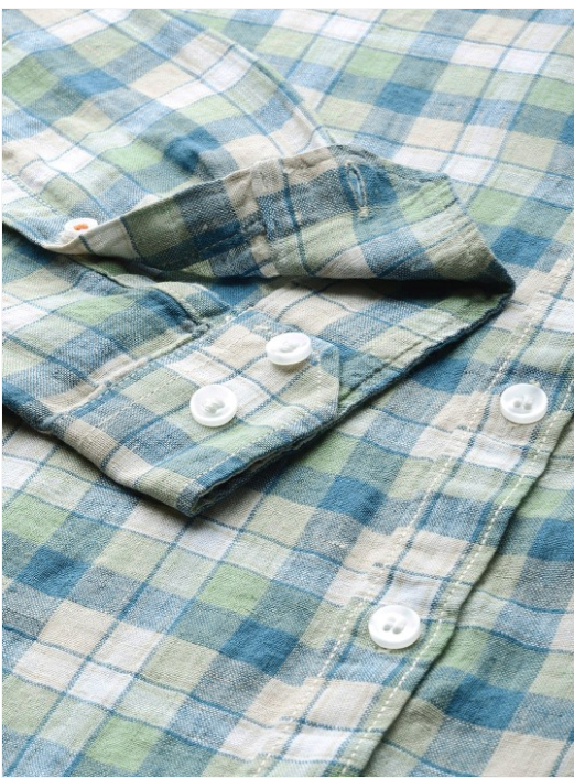 Blue and Green checked casual linen shirt, has a spread collar, long sleeves, button placket, and curved hem