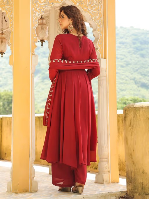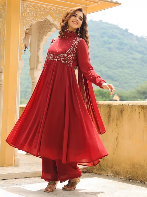 Festive Wear Just Got Better With Janasya’S Maroon Georgette Anarkali Kurta Set With Dupatta. This Anarkali Style Kurta Is Adorned With Embroidery On The Yoke, It'S Round Neck And Full Sleeves A Wonderful Contrast Against The Fit And Flare Silhouette. Included Is A Straight Maroon Palazzo With A Fully Elasticated Drawstring Waist. Complete This Ensemble With A Maroon Dupatta, Scalloped Embroidery On Its Borders.